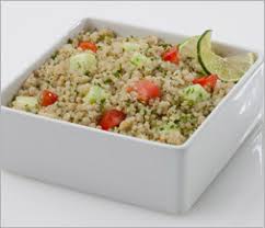 Toss quinoa with olive oil, salt or bragg liquid aminos, and lemon juice, mixing well. Gently fold in parsley and mint, followed by remaining ingredients. Cover and chill for 1 hour. Serves 1.